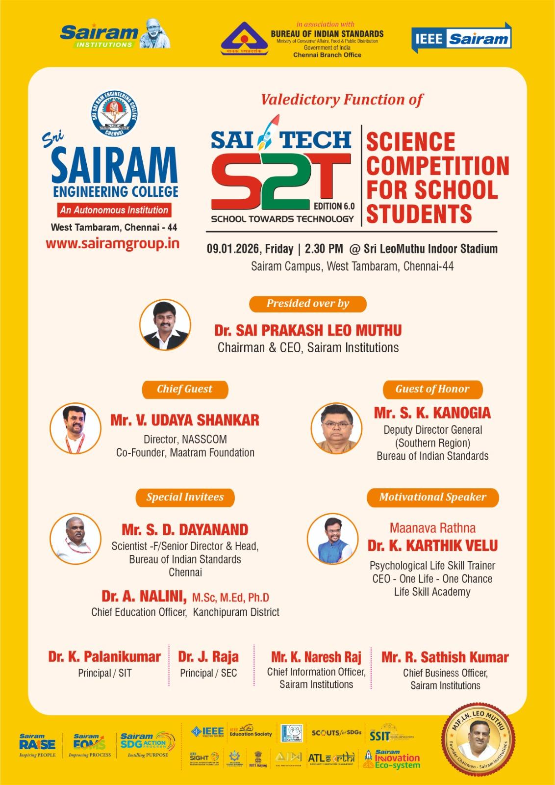 Sri Sairam Engineering College cordially invites you to the Valedictory Function of SAI TECH S2T – Edition 6.0, a prestigious Science Competition for School Students, celebrating young minds and scientific innovation.